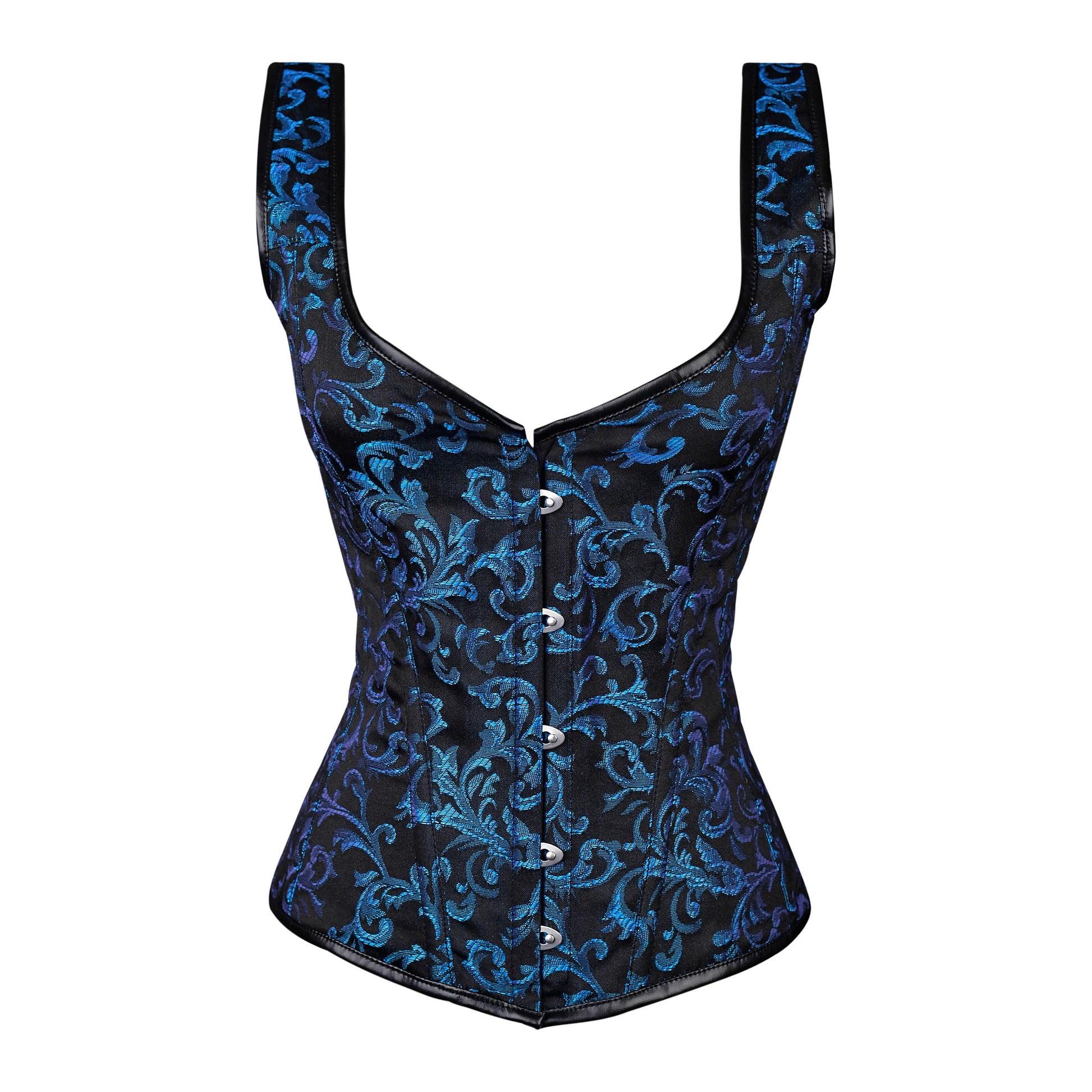Channel timeless elegance with the Blue Brocade Corset, crafted in a luxurious black satin base adorned with intricate royal blue floral embroidery. The rich baroque-inspired pattern creates a striking visual contrast, perfect for both gothic romance and evening sophistication.