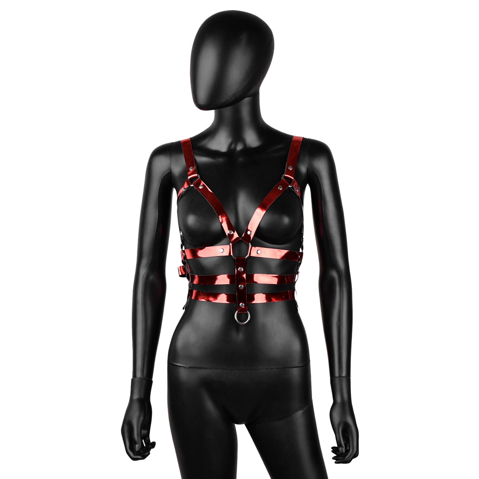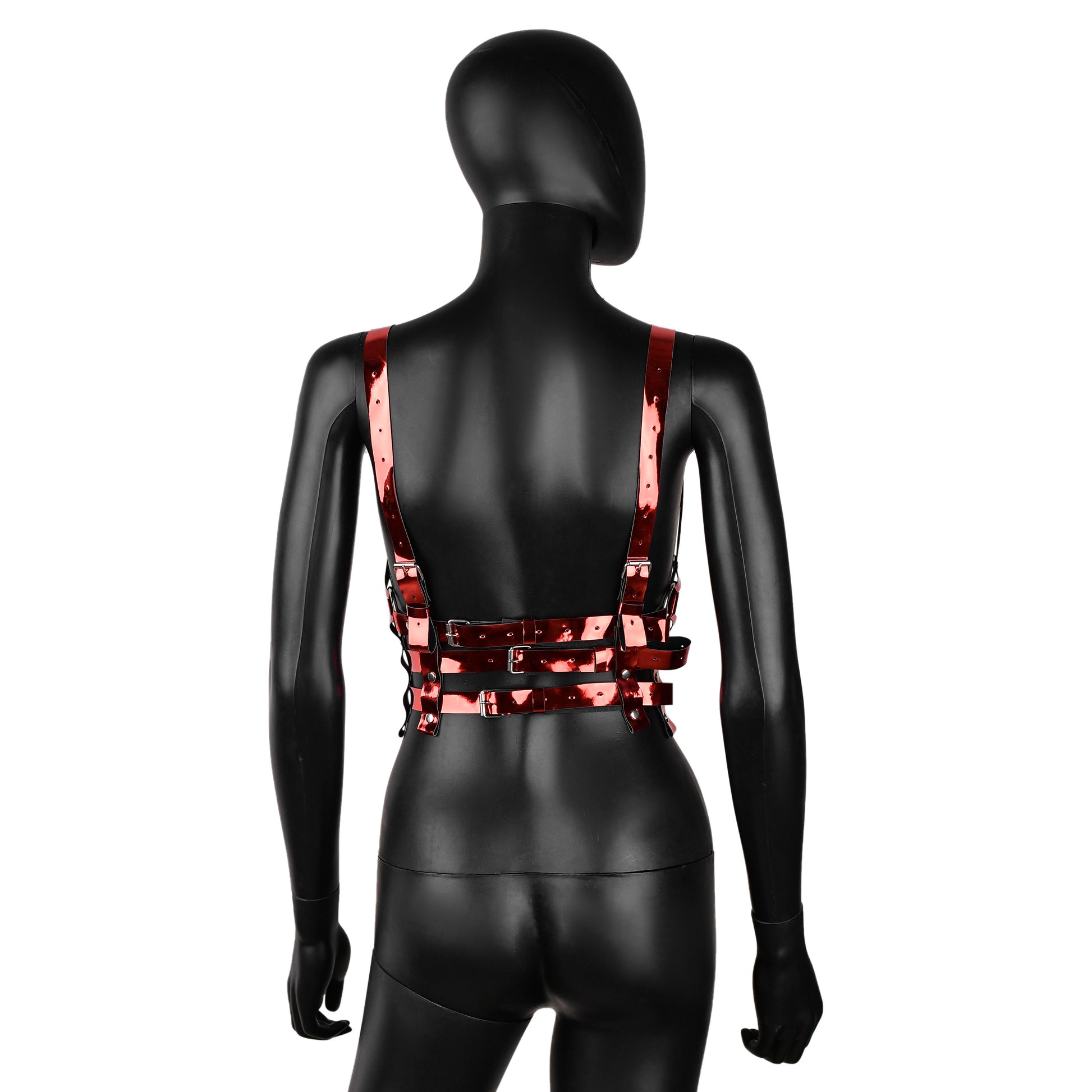 The Crimson Eclipse Harness radiates bold intensity with its fiery red metallic finish and commanding structure. Adjustable straps wrap the torso in layered precision, offering both striking aesthetics and a secure, customizable fit. A lower O-ring detail completes the design with an industrial edge.