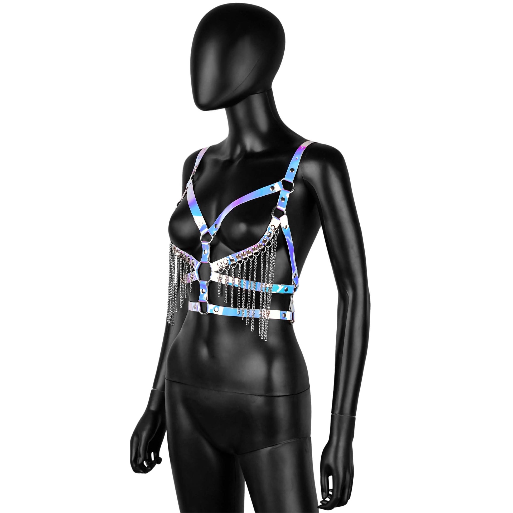 The Holographic Leather Harness with Chain Fringe is a bold statement piece that combines edgy style with versatile wear. Perfect for festivals, performances, or daring fashion looks, this harness elevates any outfit with its futuristic shine and dramatic detailing.