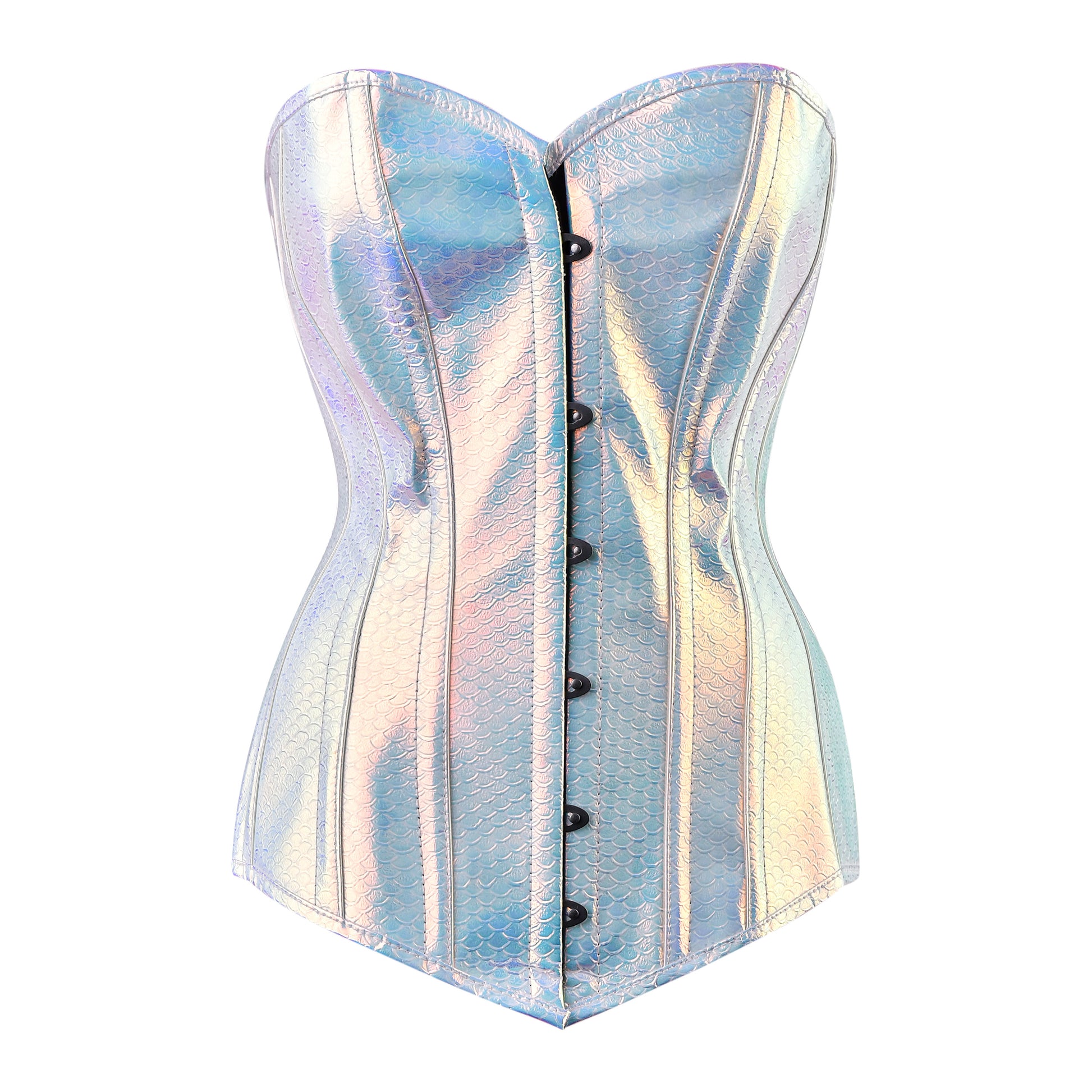 This corset shimmers like sunlight on ocean waves, with pearlescent blues, silvers, and soft rainbow reflections that move like liquid light. The embossed scale texture adds a mythical dimension, transforming it from celestial to sea goddess.