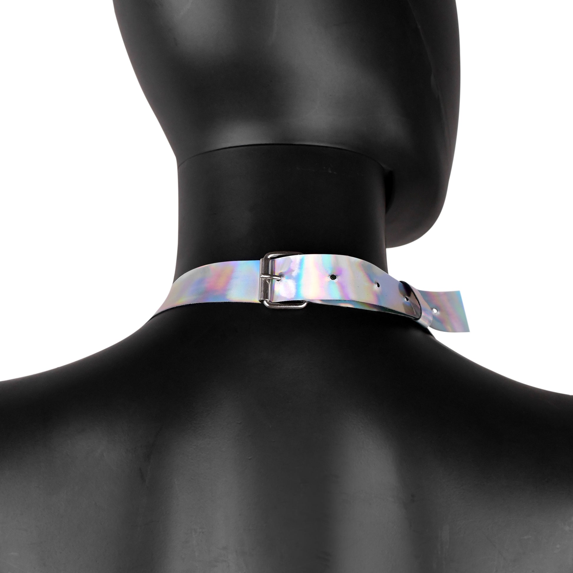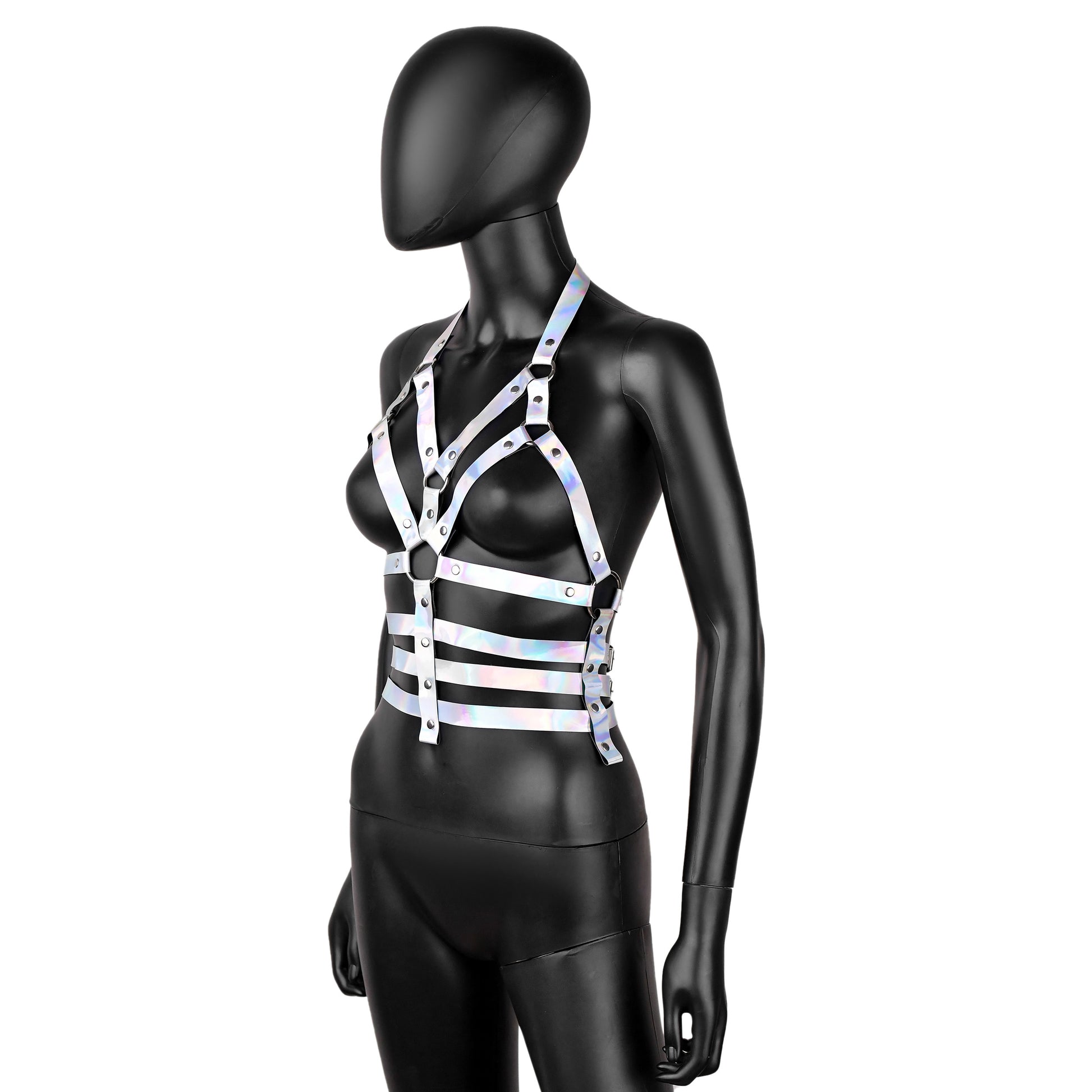 The Iridescent Vortex Harness captivates with its futuristic shine and geometric precision. Made from holographic faux leather straps, it frames the body in a striking cage silhouette anchored by a central O-ring. Multiple layered straps wrap the torso, balancing structure with fluid shimmer that reflects light in prismatic brilliance.