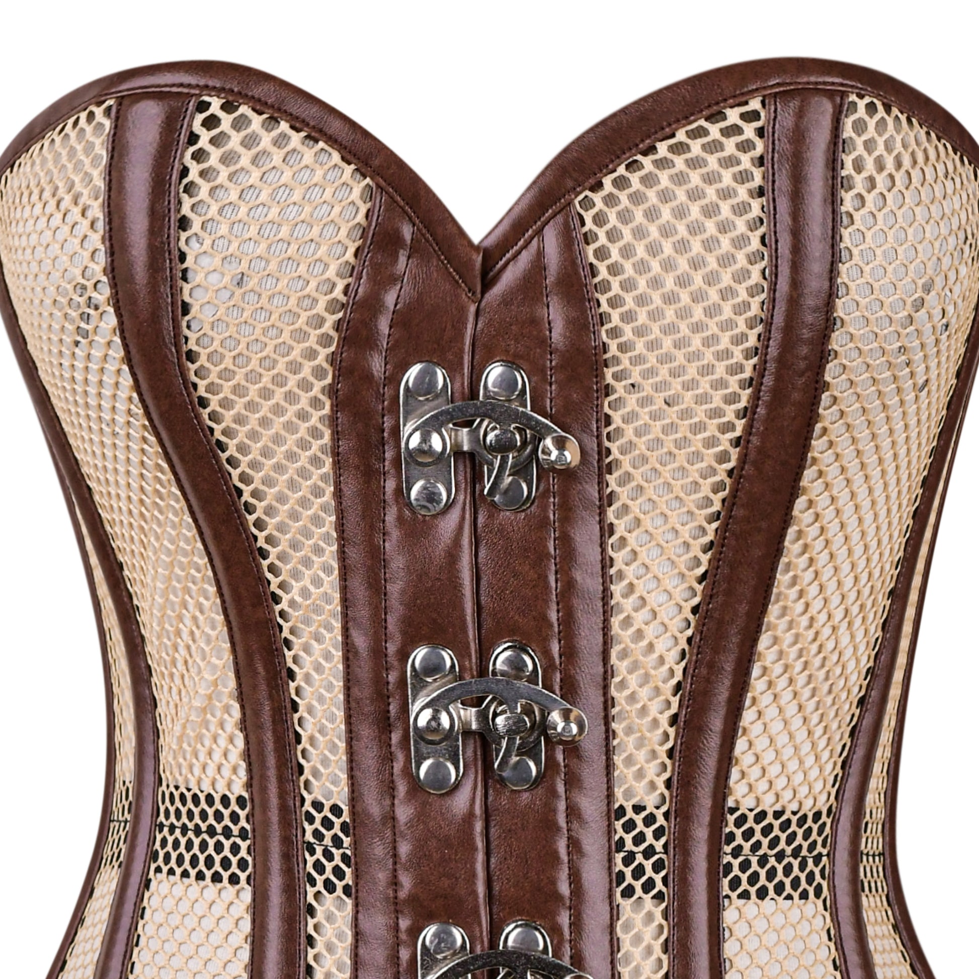 The Ironclad Siren blends industrial strength with alluring structure. Wide brown leather panels frame the body, intersected by honeycomb mesh that hints at the raw mechanics beneath. The front fastens with silver latch closures, reminiscent of steampunk machinery or reinforced armor plating, adding a functional yet decorative toughness.
