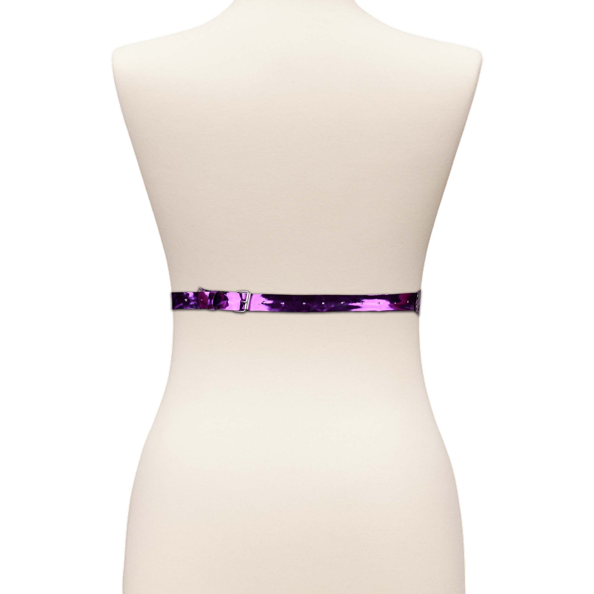 The Nebula Waist Belt shimmers with cosmic allure, designed from deep violet holographic faux leather. Its layered strap construction, connected by gleaming O-rings, creates a bold and structured silhouette that evokes the mystery and magnetism of galaxies. Perfect for commanding attention with a touch of celestial elegance.