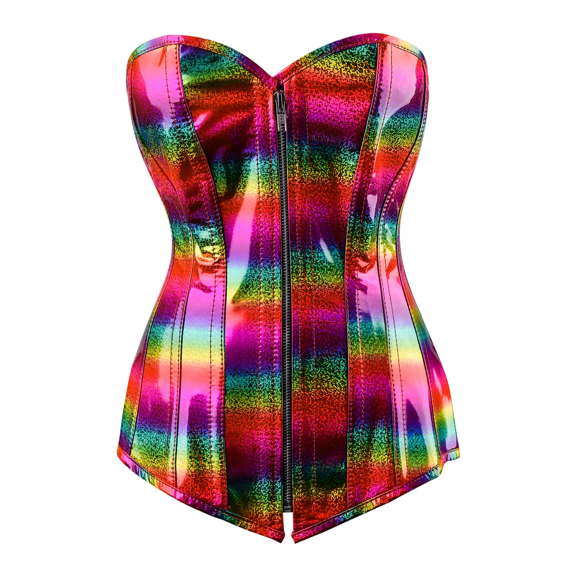 This corset bends light like a prism, shifting between electric teal, violet, gold, and pink in a hypnotic oil-slick glow. It’s the ultimate festival fantasy — the kind of piece that turns heads under UV lights and steals the stage under spotlights.