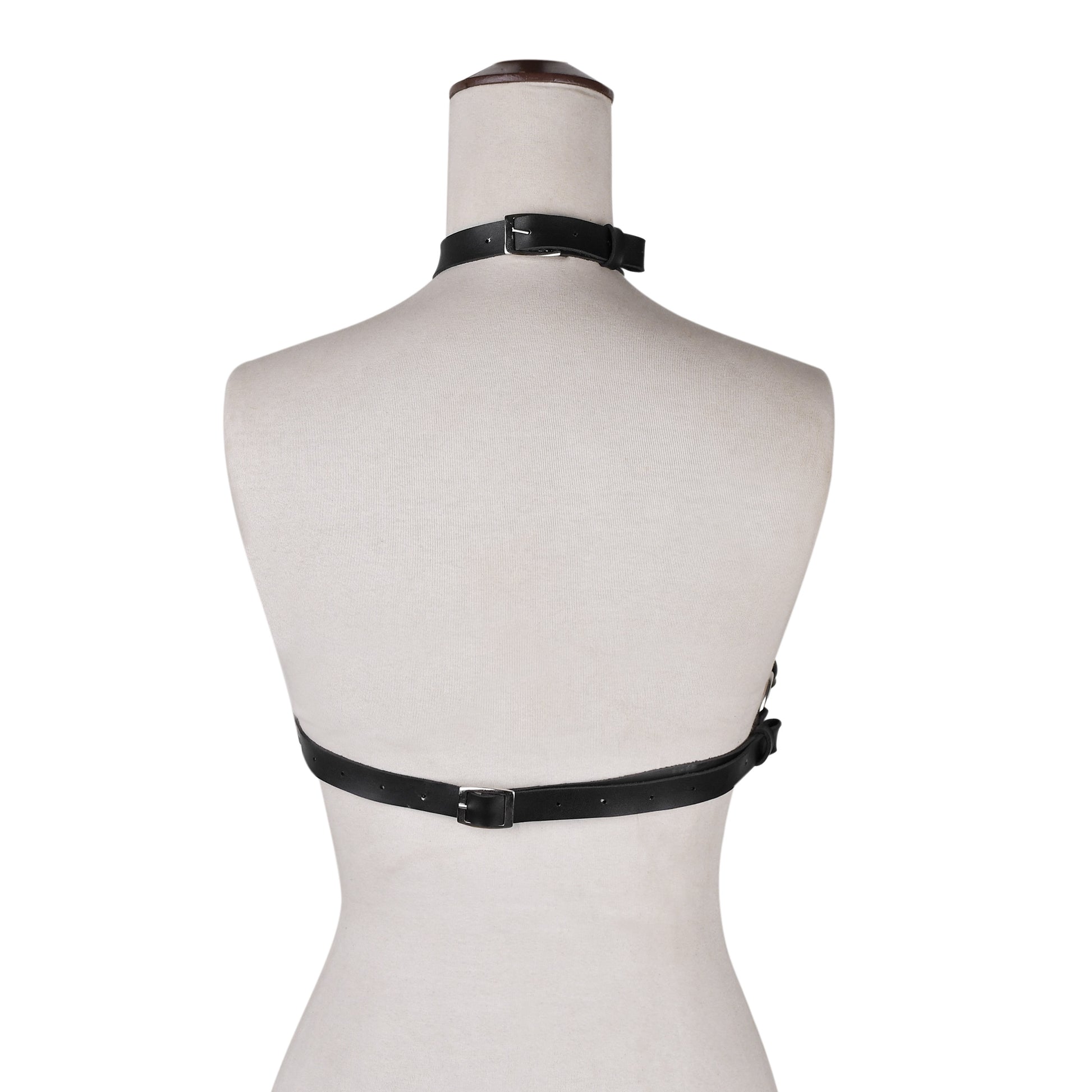 The Obsidian Cage Bra Harness exudes raw seduction with its daring open-cup design. Crafted from sleek black faux leather, it features a strappy cage bra anchored by a central O-ring that commands attention. The choker collar connects with a bold vertical strap, fusing elegance with restraint-inspired edge.