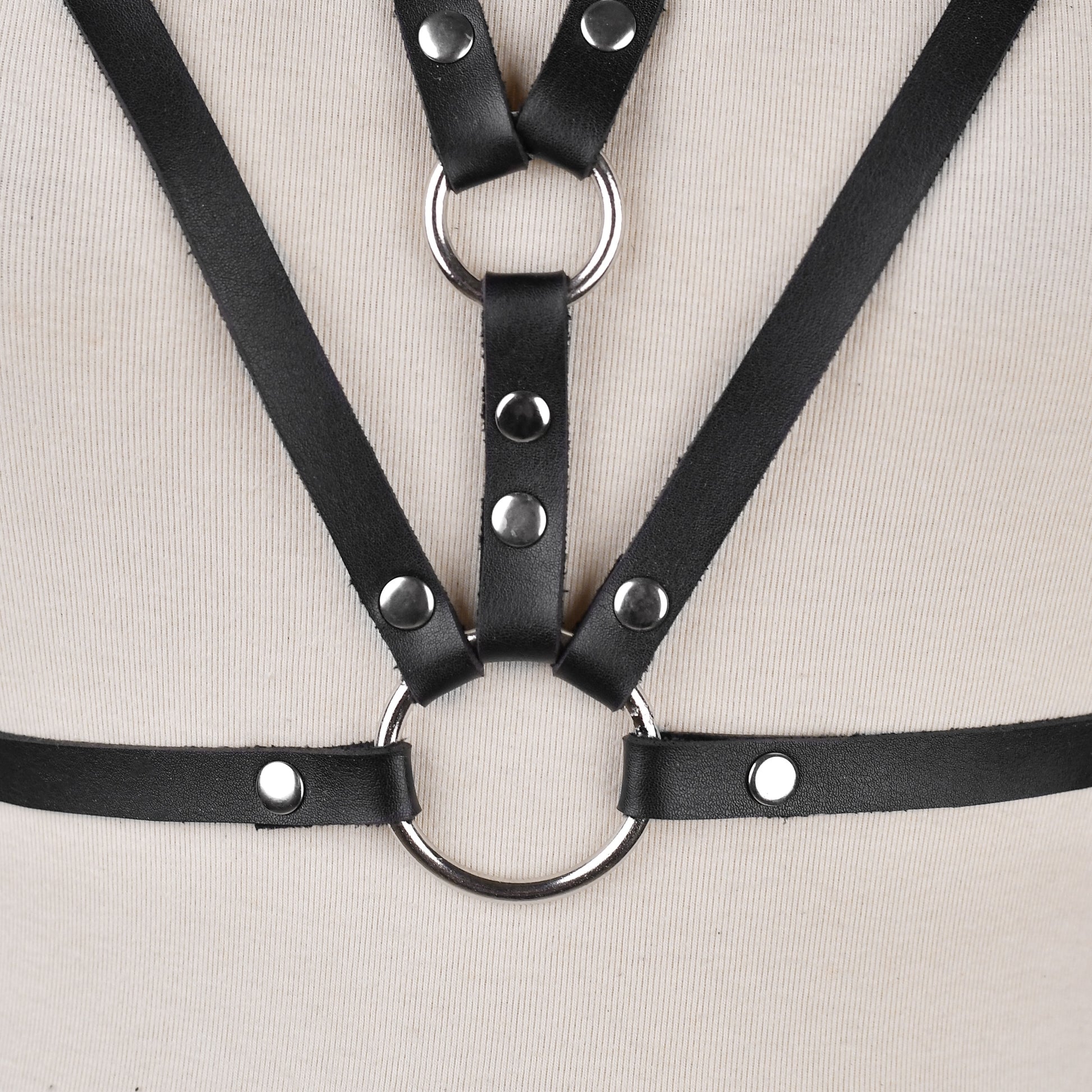 The Obsidian Web Harness weaves sleek minimalism with bold design. Constructed from matte black faux leather, it features a striking geometric cage formation built from multiple straps connected by polished O-rings. Simple yet commanding, it brings versatility to both fashion layering and statement styling.
