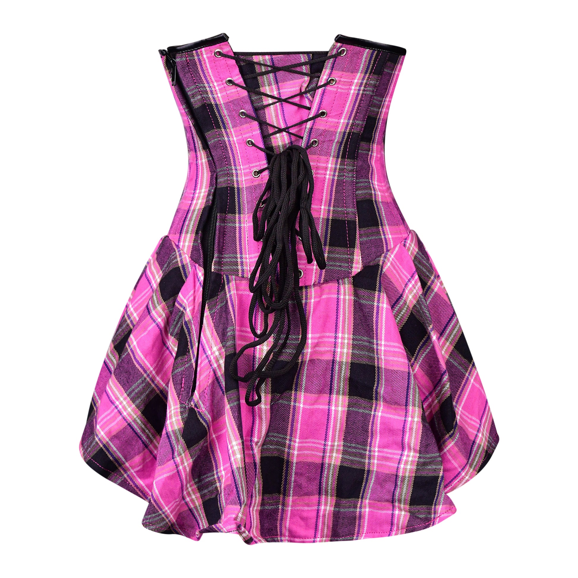 Turn heads with this punk-chic plaid corset dress in bold pink and black tartan. The sweetheart overbust neckline flatters the bust, while the cinched waist and structured boning sculpt your figure. The playful draped skirt panels add movement, balancing gothic edge with youthful rebellion.