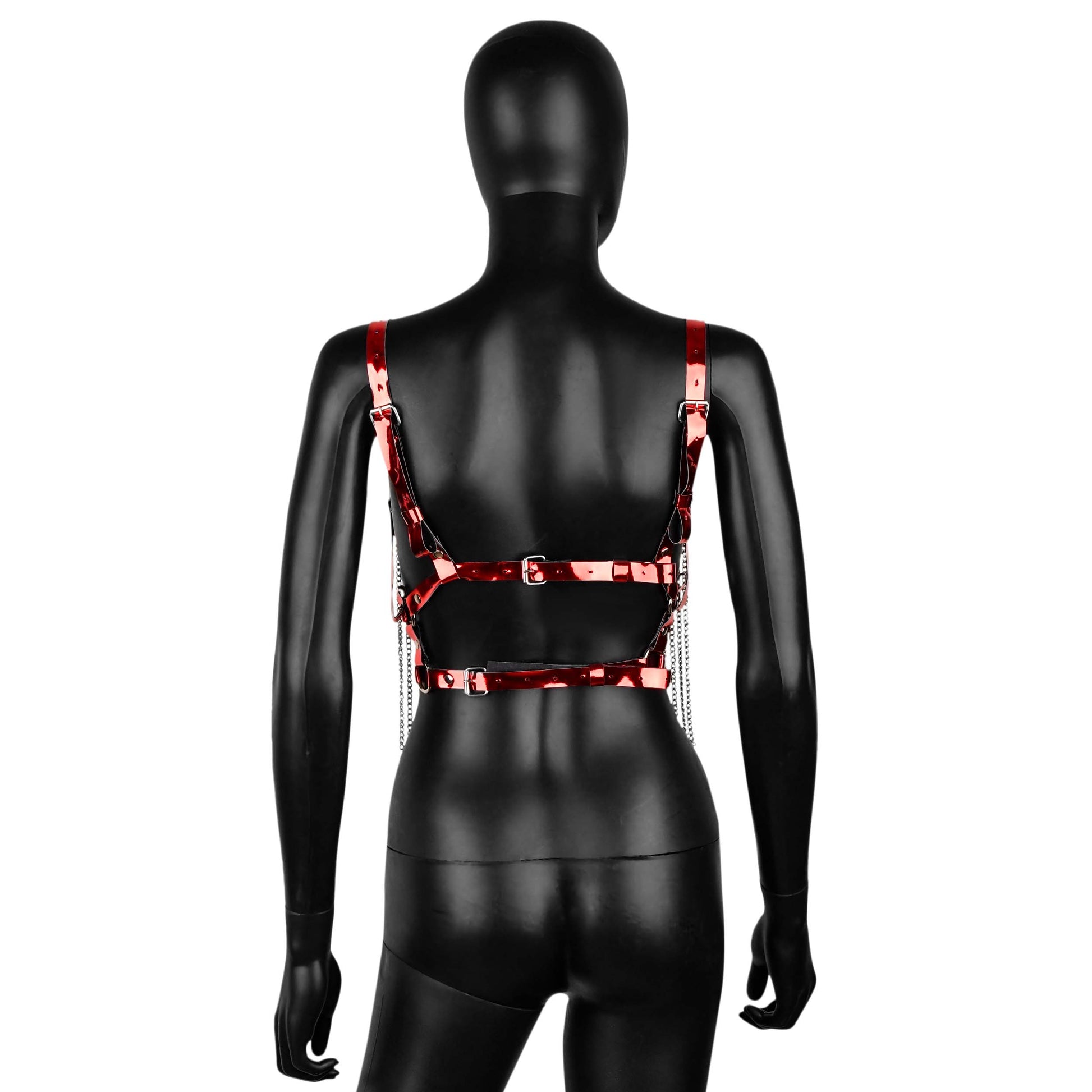 This leather harness boasts superior craftsmanship with its structured straps, riveted details, and flowing chain accents that move with your body. Whether worn over clothing or styled as a standalone statement, it offers a dependable solution for bold fashion styling. Invest in your look now and experience the renowned performance of this Red Leather Harness for yourself!