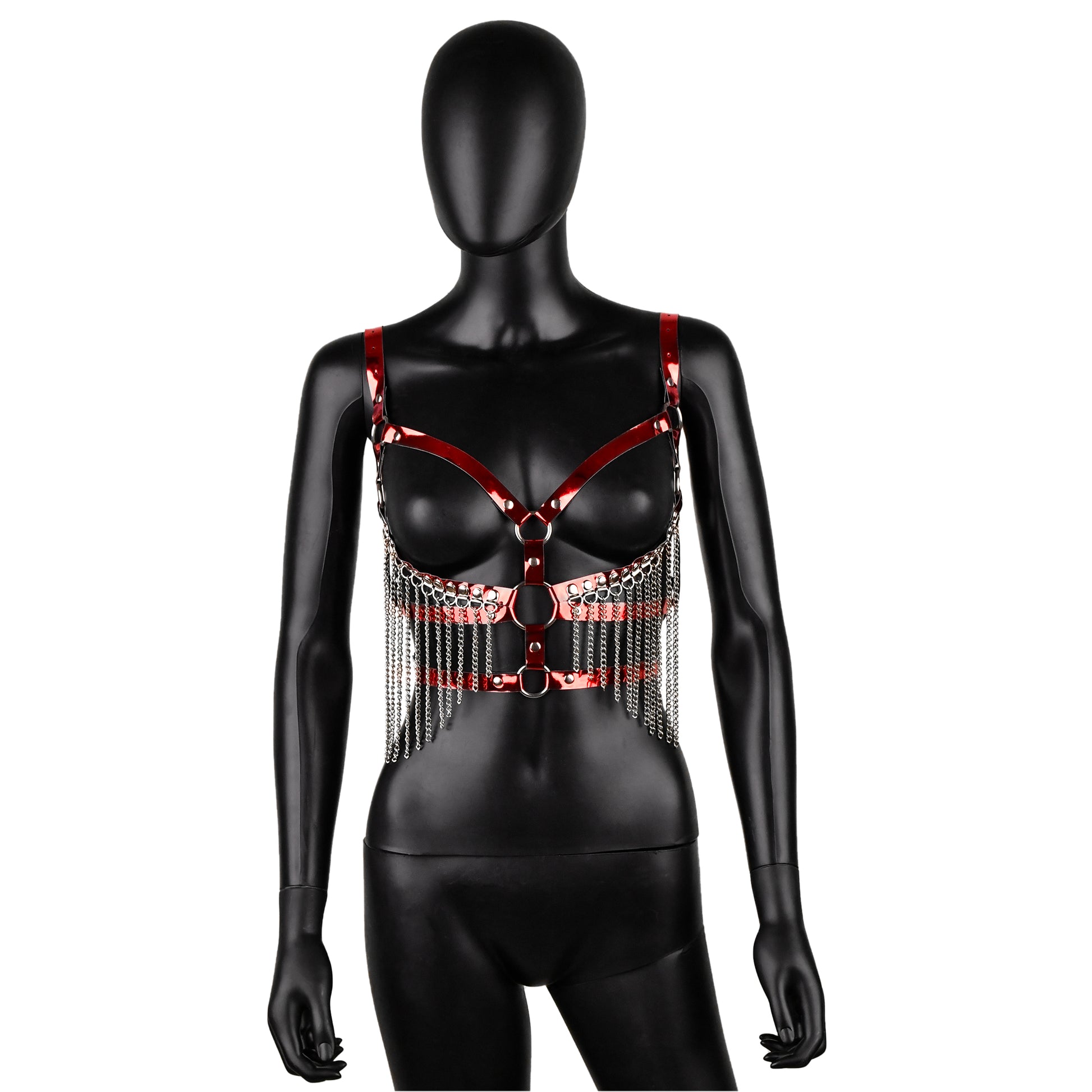 The Red Leather Harness with Chain Fringe is a daring and versatile accessory that serves multiple purposes, including statement styling, layering for fashion outfits, and enhancing bold festival or performance looks. It is a striking investment for achieving your desired edgy and powerful appearance.