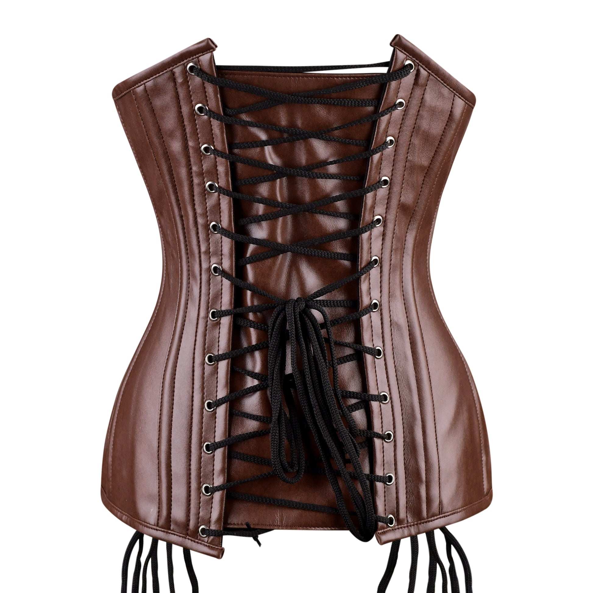 For the daring and untamed, the Rogue Seduction Corset fuses gothic sensuality with outlaw grit. Crafted from smooth brown faux leather, its structured design sculpts the body while side lace-up panels with long ties bring drama and adjustability.