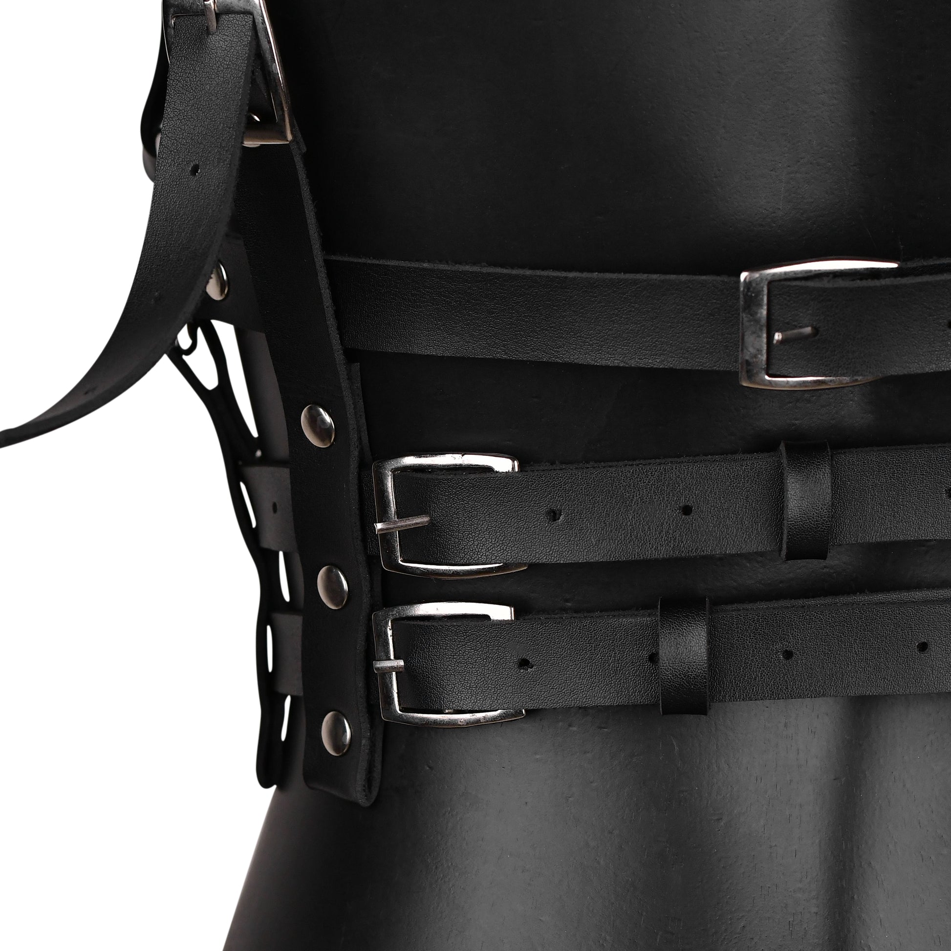 A stark black leather harness forged for the Dominion’s covert enforcers. Its clean, angular design reflects discipline and control, with O-rings binding the structure together.