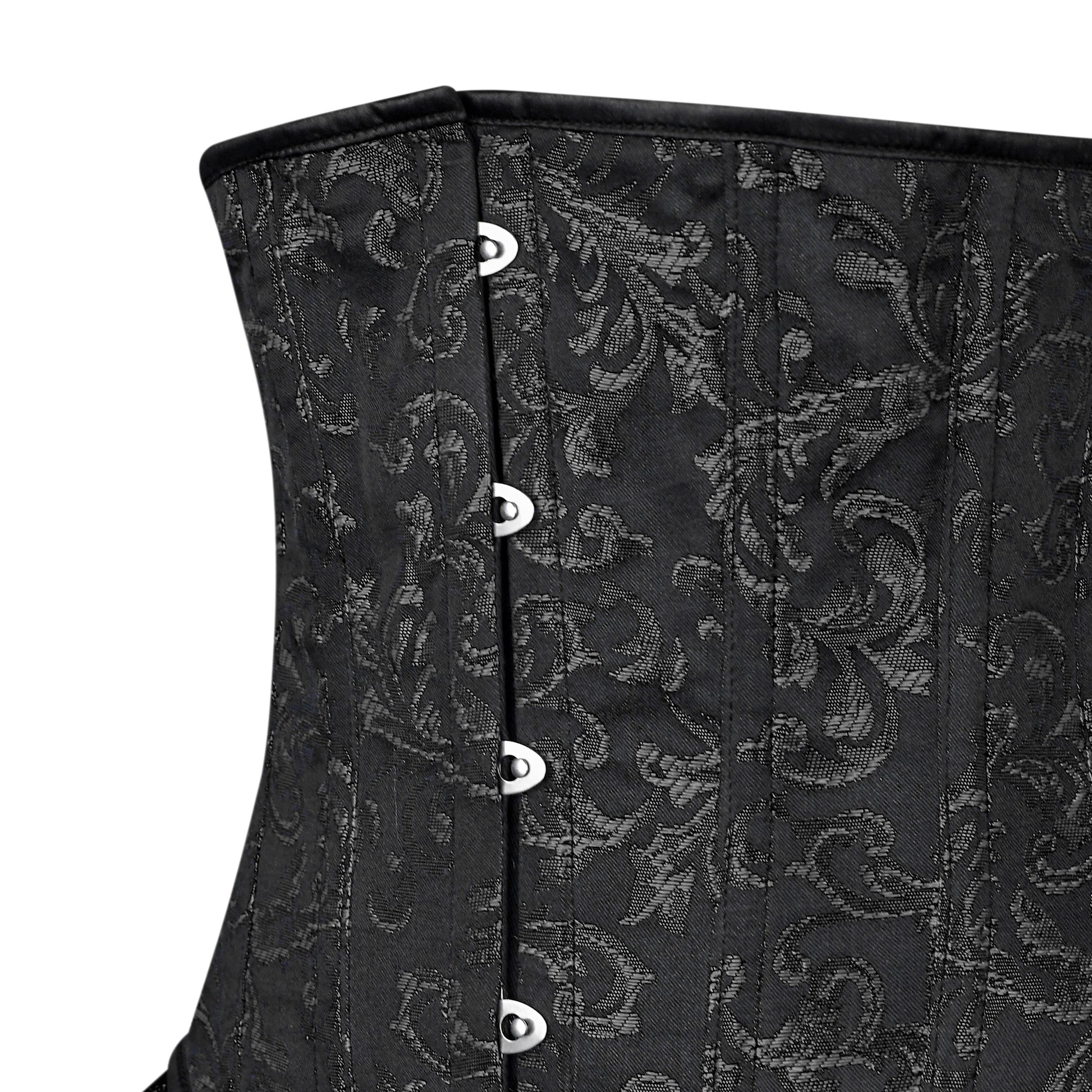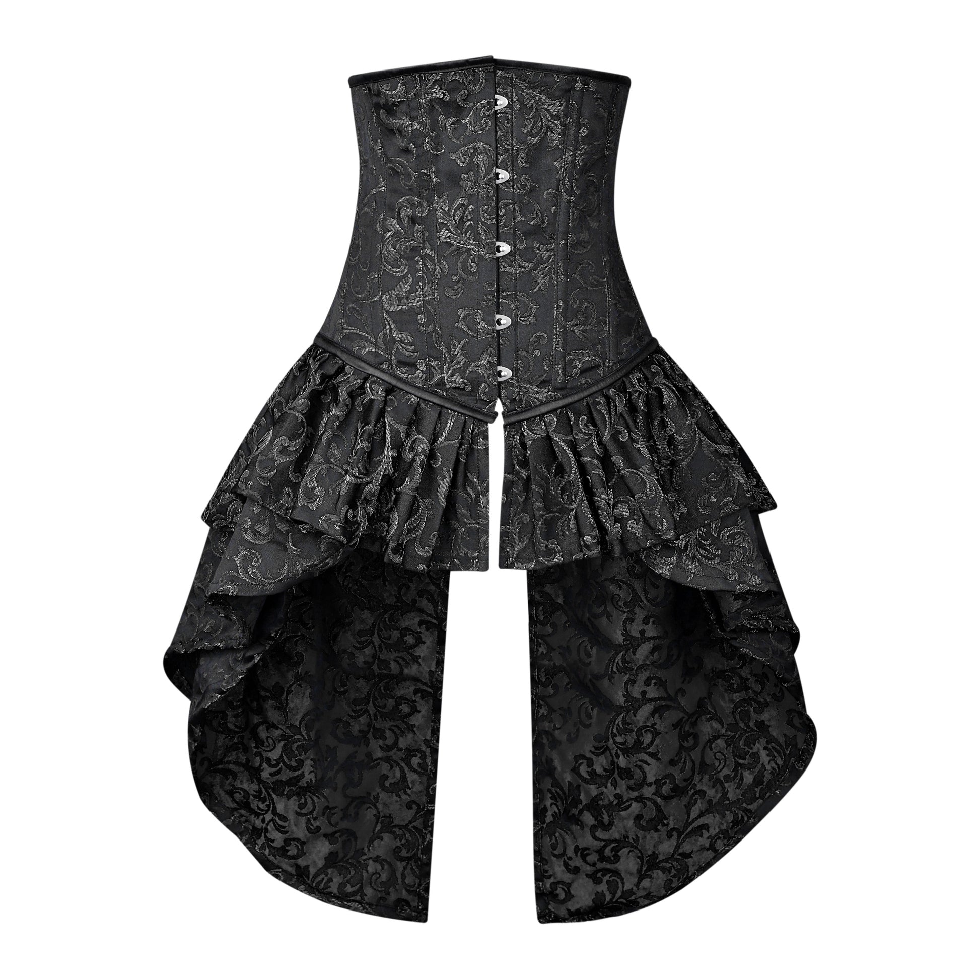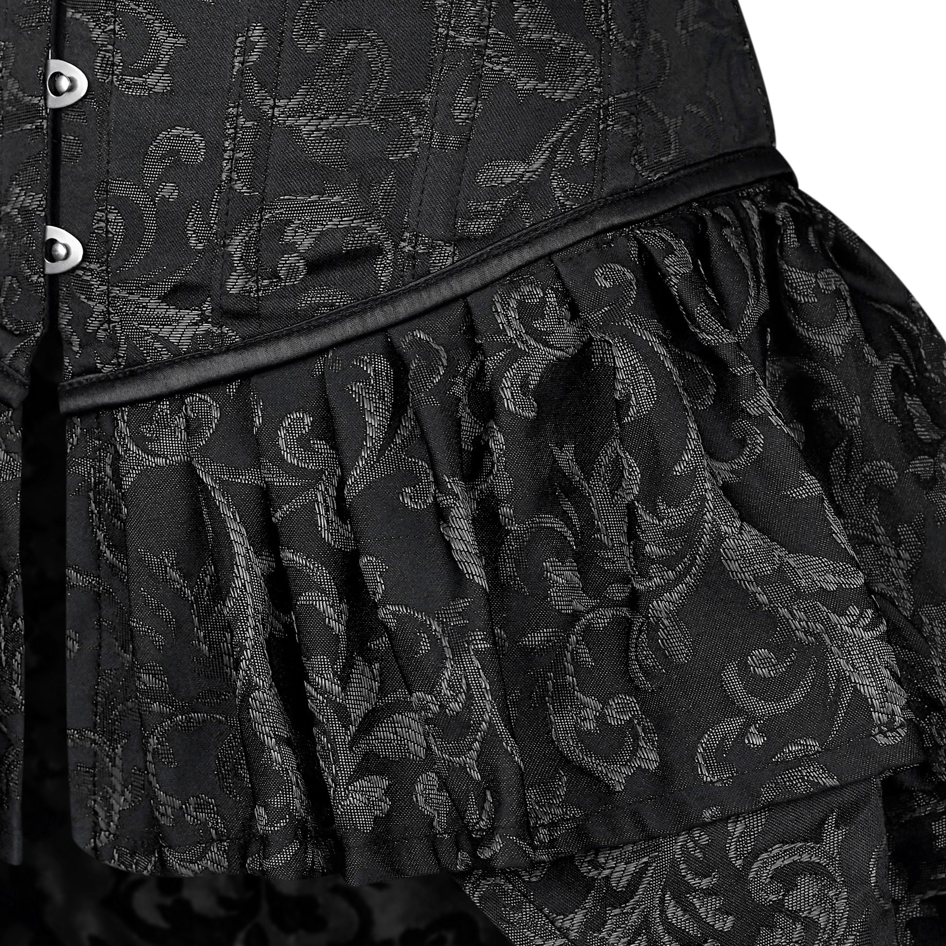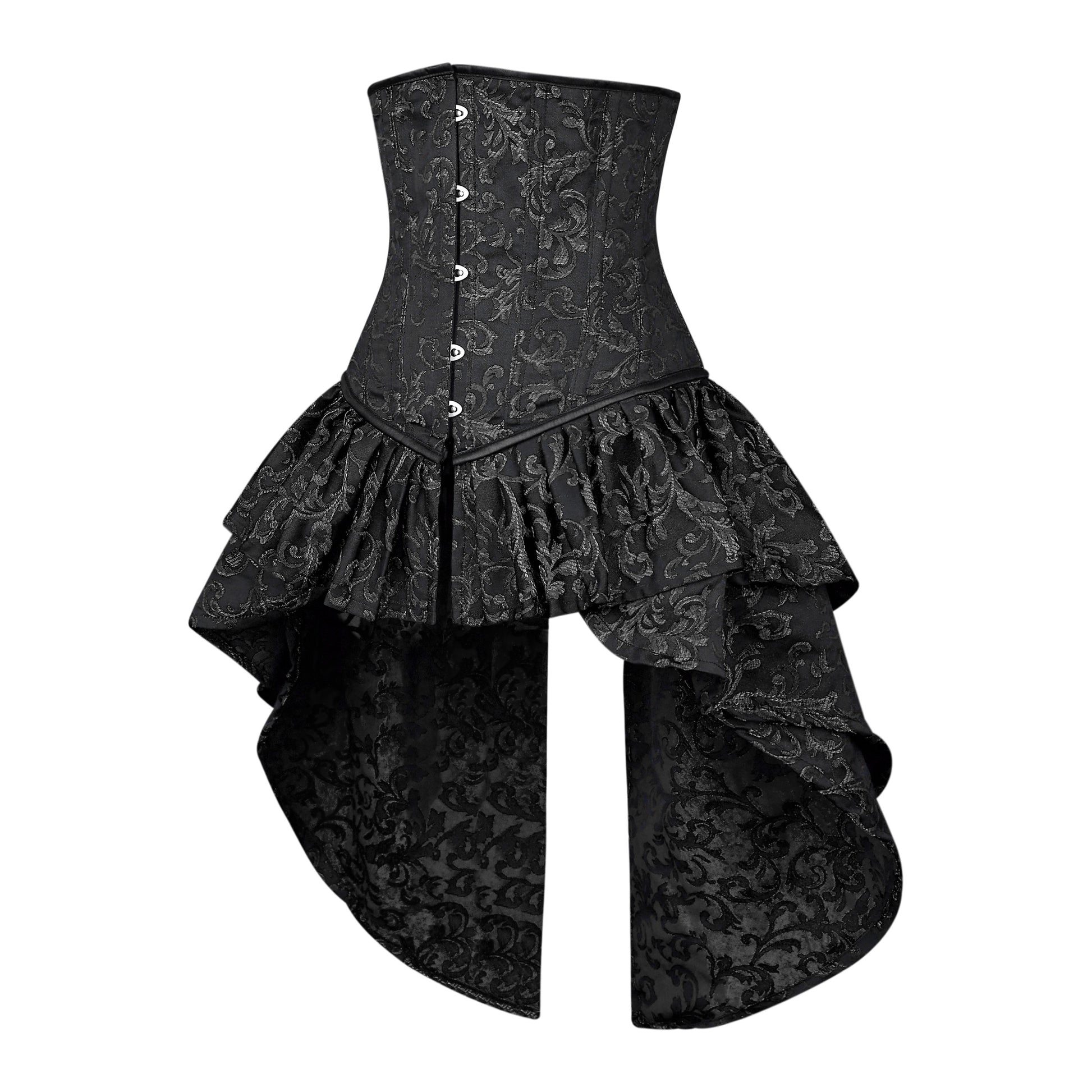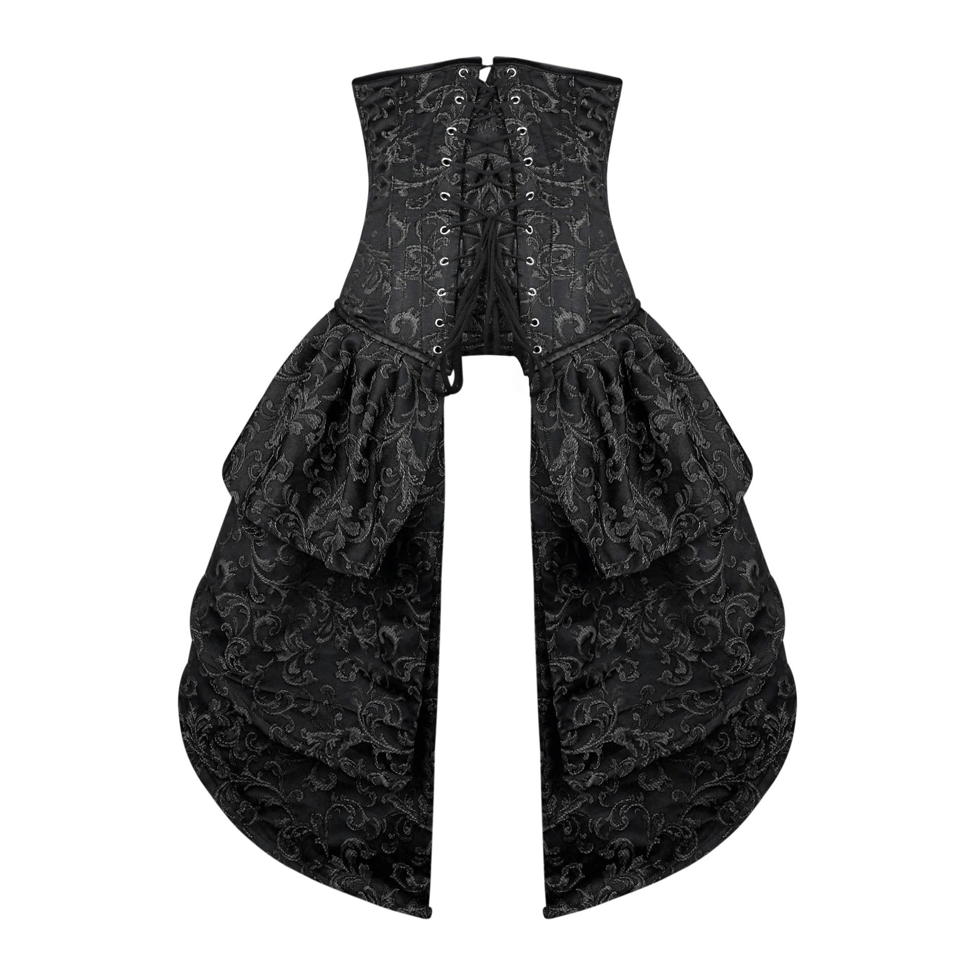 Embrace your inner gothic empress with this black and silver baroque corset-skirt hybrid. The front steel busk closure keeps the corset structured and supportive, while the attached cascading bustle skirt adds theatrical flair. The silver embroidery dances across the deep black satin base, creating an aura of mystery and aristocratic charm.